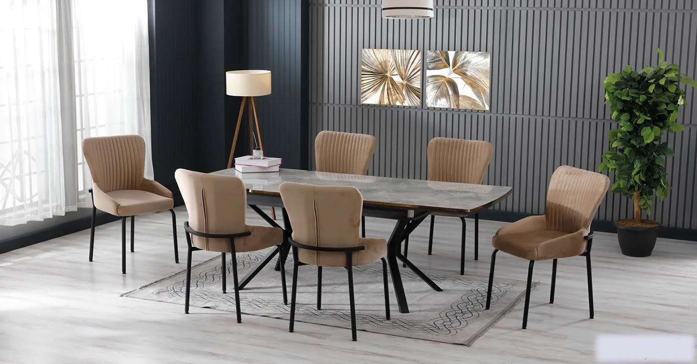Ürünümüz: MDF Glossmax Tabla Masa, 6 Sandalye dir. Ürün Boyutu: Kapalı 80x130 CM - Açık 175x80 CM | Ürün malzeme detayları resimlerde mevcuttur. Silinebilir babyface kumaş, masa ve sandalye tüm renk seçenekleri mevcuttur. Sandalye ek istenirse adet fiyatı: 4.850 TL dir.