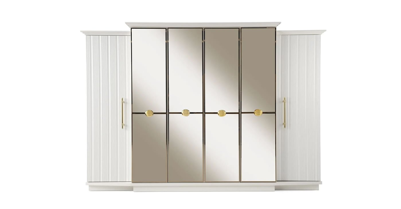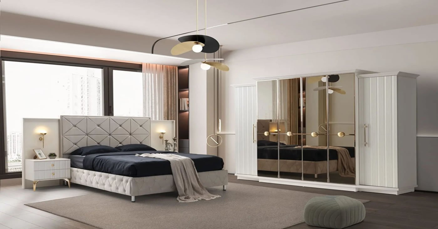 Yatak odası takımımız tamamen MDF'den üretilmiştir. Kapakları 1. sınıf membran kaplamadır. Takımın tüm kapakları CNC ve bronz ayna kullanılarak tasarlanmıştır. Dolap kapaklarında frenli menteşe kullanılmıştır. Dolap içlerinde ledli elbise askılığı kullanılmıştır. Dolap arkaları geçmeli ve 5 mm'dir. Dolap içerisinde teleskopik raylı iki adet gizli çekmece bulunmaktadır. Dolap, şifonyer ve komodinlere minfix montajı yapılmıştır. Dolap altlarında baza bulunmaktadır. Komodinler çift çekmece ve panellidir. Komodinlerde dokunmatik aplikler bulunmaktadır.
